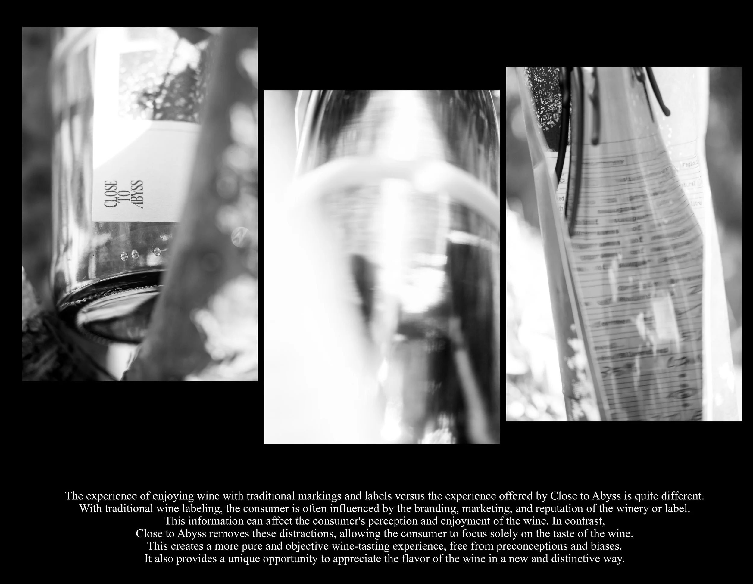 The experience of enjoying wine with traditional markings and labels versus the experience offered by Close to Abyss is quite different. With traditional wine labeling, the consumer is often influenced by the branding, marketing, and reputation of the winery or label. This information can affect the consumer's perception and enjoyment of the wine. In contrast, Close to Abyss removes these distractions, allowing the consumer to focus solely on the taste of the wine. This creates a more pure and objective wine-tasting experience, free from preconceptions and biases. It also provides a unique opportunity to appreciate the flavor of the wine in a new and distinctive way.